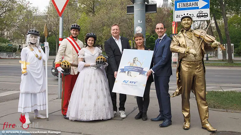 Zum Auftakt einer aktuellen KFV-Kampagne wird die Bevölkerung auf der Wiener Ringstraße zum Helmtragen animiert. Am 21. April sowie von 6. bis 8. Mai 2026 sind beim Burgtheater und an weiteren zentralen Standorten am Ring mobile Pantomimen mit goldenem Helm im Einsatz. Ein besonderes Highlight: Die Figuren sehen aus wie Kaiser Franz Joseph, Kaiserin Elisabeth („Sisi“), Walzerkönig Johann Strauss und die Göttin der Weisheit, Pallas Athene. „Kluge Köpfe tragen Helm – egal wie alt sie sind“, lautet das Motto der Kampagne. „Wer will, kann sich mit den ‚Helm-Promis‘ gerne auch fotografieren lassen und die Bilder in den sozialen Medien teilen, um auf diese wichtige Botschaft aufmerksam zu machen“, betont Mag. Schimanofsky.
