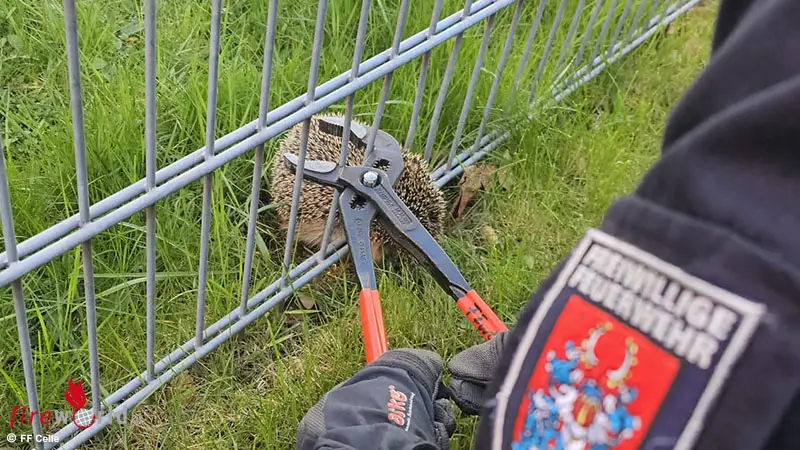 Ein Igel steckte in einem Zaun fest. Mit einer Zange konnten die Drahtstreben des Zauns verbogen und die betroffene Öffnung somit vergrößert werden. Behutsam konnte der Igel so aus seiner misslichen Lage befreit werden.