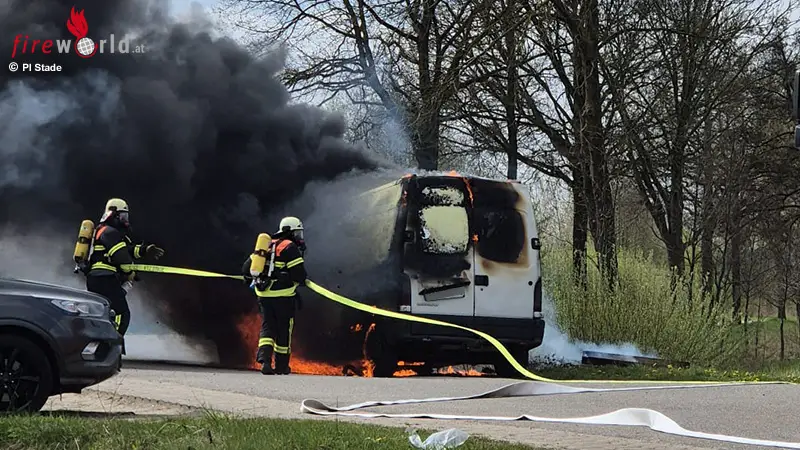 JORK (DEUTSCHLAND): Am Vormittag des 23. April 2026 war ein 80-jähriger Fahrer eines Firmentransporters gegen 10:45 Uhr in Jork-Ladekop auf der Kreisstraße 26 unterwegs, als das Auto plötzlich vermutlich durch einen technischen Defekt in Brand geriet.