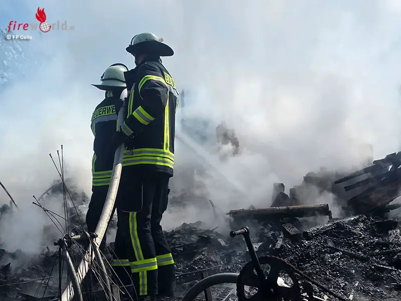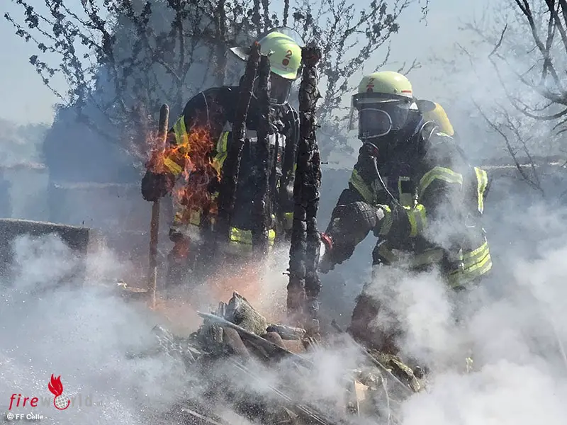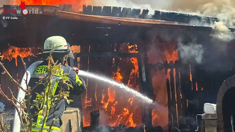 CELLE (DEUTSCHLAND): Am Samstag, 25. April 2026, um 13:29 Uhr wurde die Feuerwehr Celle zunächst zu einer unklaren Rauchentwicklung in die Kleingartenkolonie Friedrichslust alarmiert. Bei Eintreffen der ersten Einsatzkräfte waren bereits offene Flammen sichtbar. Die Rauchentwicklung war von Weitem zu erkennen. Aufgrund der Lage ließ der Einsatzleiter eine Alarmstufenerhöhung veranlassen und weitere Einsatzkräfte nachalarmieren.