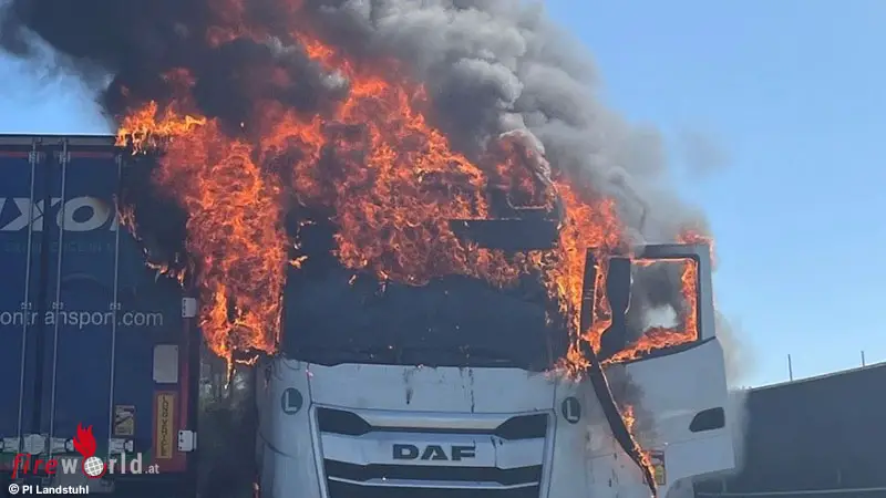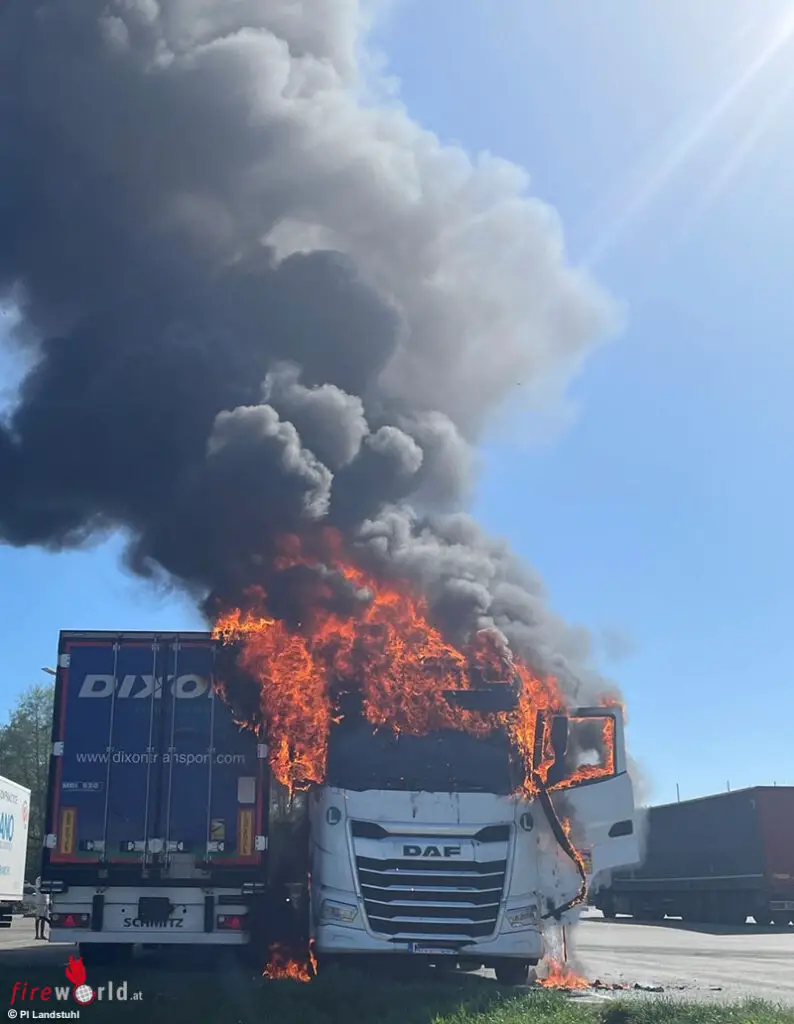 RAMSTEIN-MIESENBACH (DEUTSCHLAND): Am Samstagnachmittag, 25. April 2026, kam es am Autohof in Ramstein-Miesenbach zu dem Brand eines Lkw, bei dem das Führerhaus des Fahrzeugs vollständig ausbrannte.