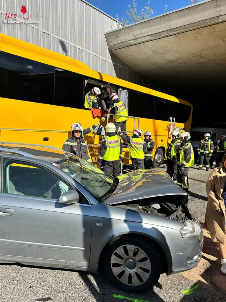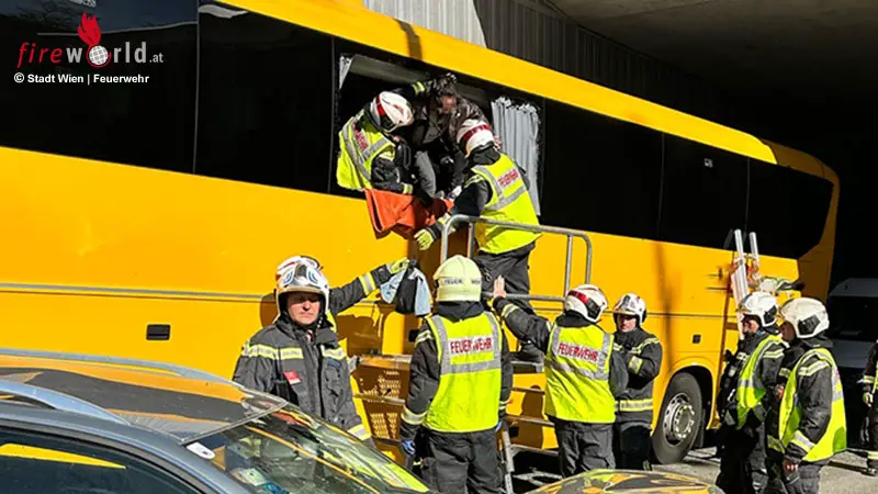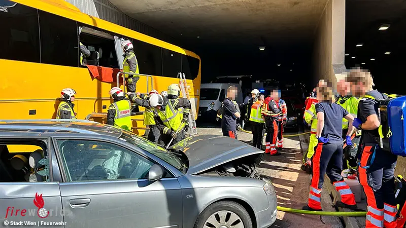 Wien: Reisebus prallt bei Eurogate Tunnelausfahrt gegen Pkw → 15 Personen aus Bus befreit