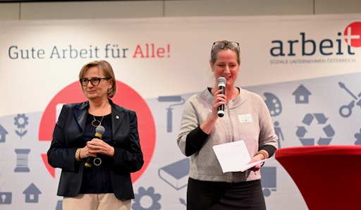 Bundesministerin Korinna Schumann und AMS-Vorstandsvorsitzender Johannes Kopf betonen die Bedeutung Sozialer Unternehmen für die Arbeitsmarktpolitik.