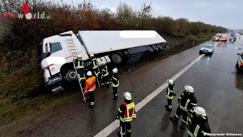 D: Sattelzug lehnt sich auf der A1 an die Böschung