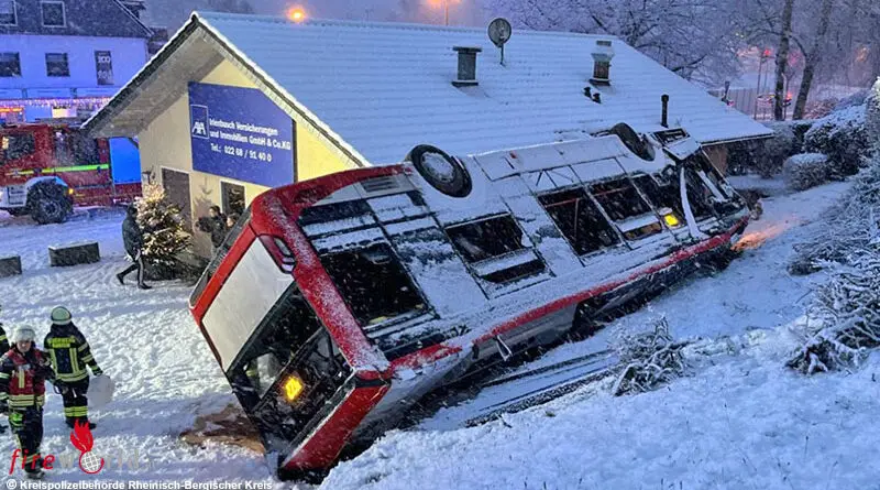 D: Autobus stürzt über Böschung und verkeilt sich am Dach liegend an Wohnhaus
