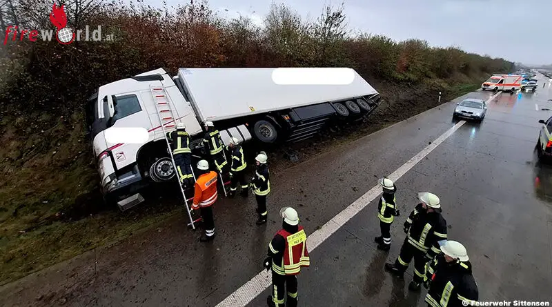 D: Sattelzug lehnt sich auf der A1 an die Böschung