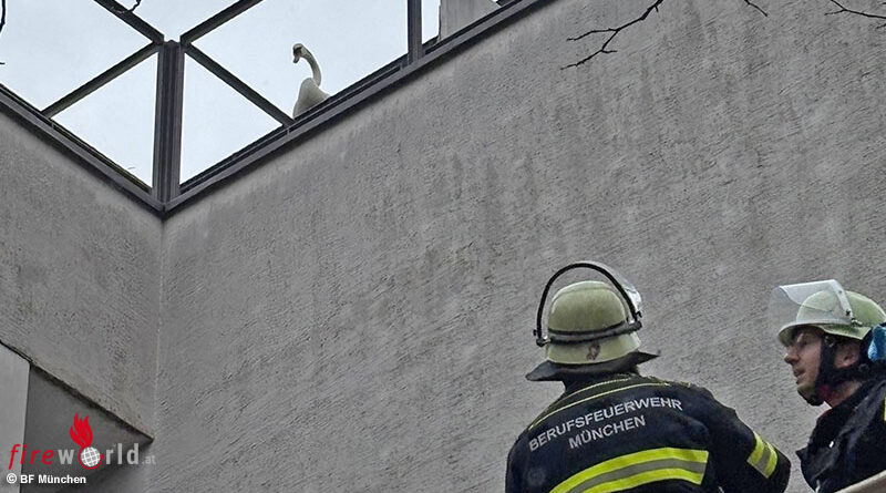 mehr lesen ...MÜNCHEN (BAYERN): Ein Schwan ist am Dienstag, 24. Februar 2026, auf dem Dach eines Mehrfamilienhauses