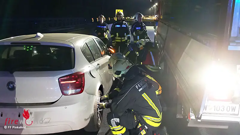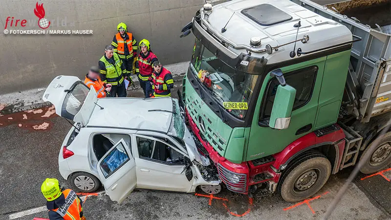 Oö: Pkw klemmt nach Frontalkollision teilweise unter Lastwagen → schwierige Personenrettung