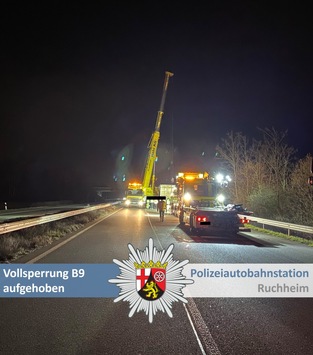 Limburgerhof (ots) – Bezug: Unsere Pressemeldung von gestern, 19:49 Uhr (https://www.presseportal.de/blaulicht/pm/117687/6232177) Nach Abschluss der Bergungsarbeiten wurde die Vollsperrung der B9 um 01:45 Uhr aufgehoben. Während der Sperrung war …