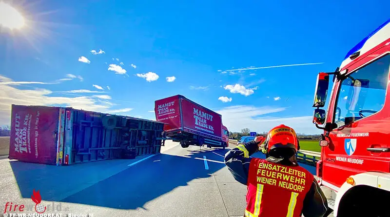 Nö: Sturm wirft Lkw-Anhänger auf A2 um, Zugfahrzeug hängt in der Luft, Totalsperre der Autobahn