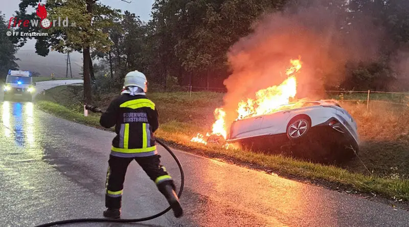Nö: Fahrzeugbrand nach Pkw-Kollision mit Betonrohr bei Ernstbrunn