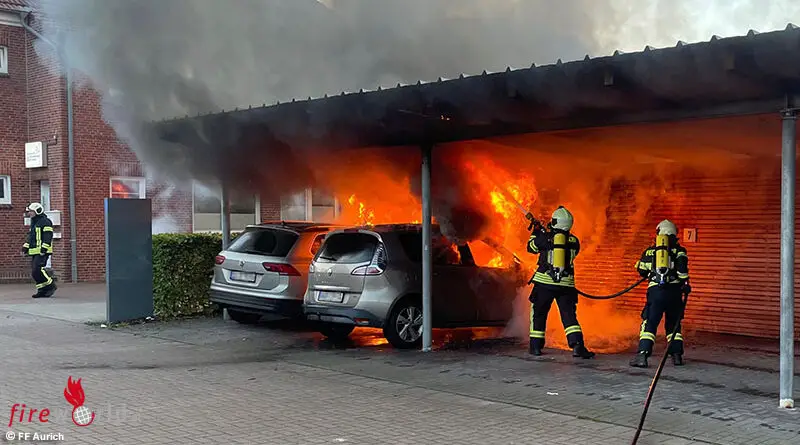 mehr lesen ...AURICH (DEUTSCHLAND): Zwei unter einem Carport abgestellte Fahrzeuge standen am Samstagmorgen, 18. Oktober 2025, im
