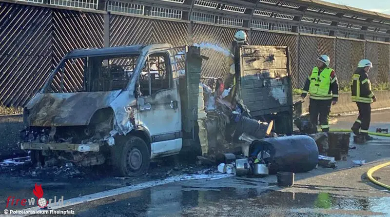 D: In Vollbrand stehender Pritschenwagen auf der BAB 6 bei Grünstadt