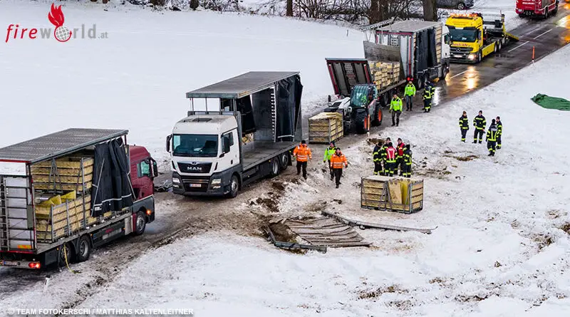 Oö: Anhänger mit rund 2.000 Hühnern auf rutschiger Straße umgestürzt