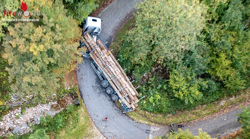 Oö: Aufwendige Bergung eines umgestürzten Holz-Sattelschleppers in Molln