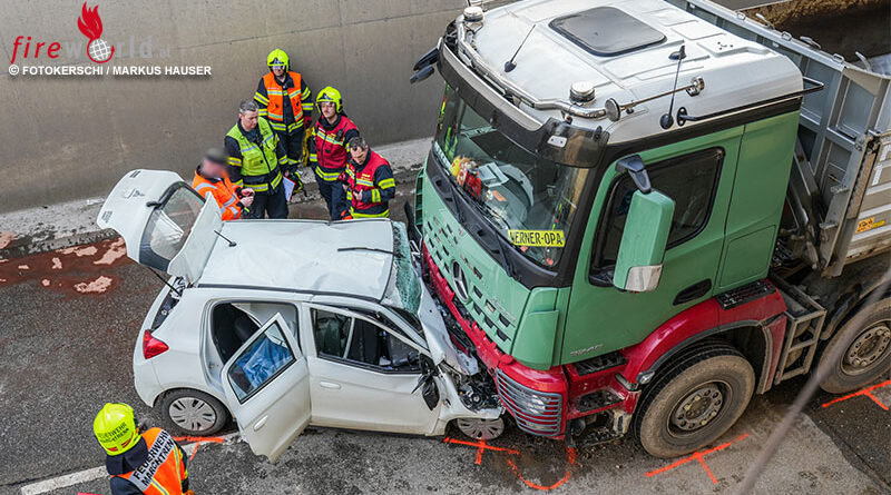 Oö: Pkw klemmt nach Frontalkollision teilweise unter Lastwagen → schwierige Personenrettung
