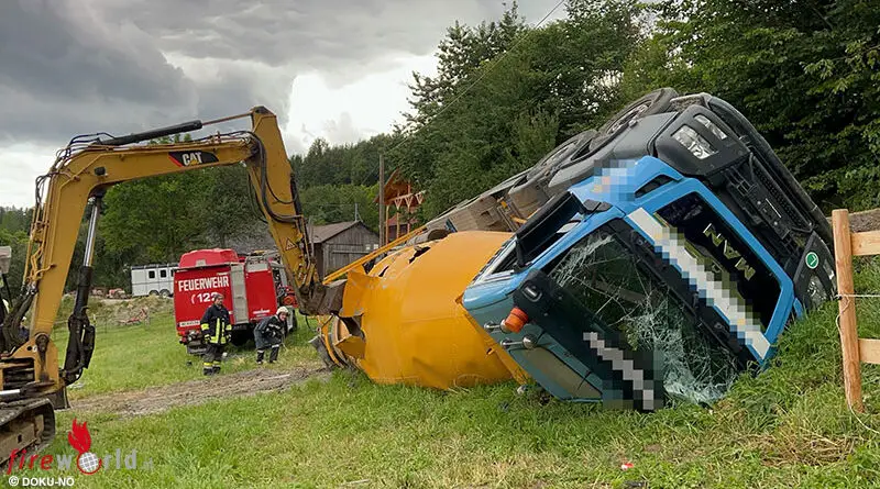 Nö: 4-Achs-Betonmischer bei Pöggstall über Böschung gestürzt → Trommel musste geöffnet werden
