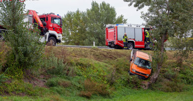Kleintransporter kommt von der Fahrbahn ab und hängt auf der Böschung - Baum verhindert weiteres abrutschen
