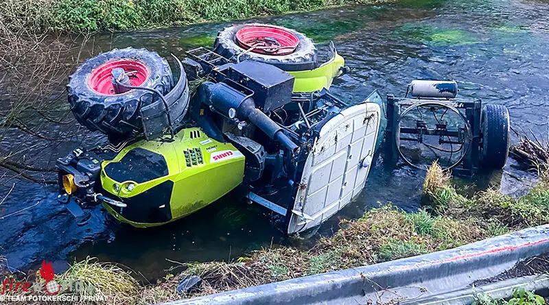 Oö: Traktor und zwei mit Mais beladenen Anhängern im Flussbett gelandet