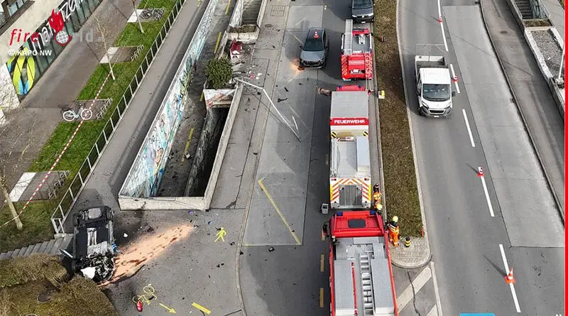 Schweiz: Pkw fliegt nach Kollision über Unterführung → 7-jähriges Kind am Gehsteig schwer verletzt
