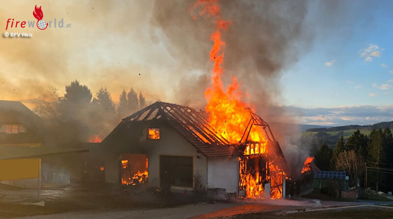 Stmk: Vollbrand eines Wirtschaftsgebäudes in der Gemeinde Birkfeld → 13 Feuerwehren im Einsatz